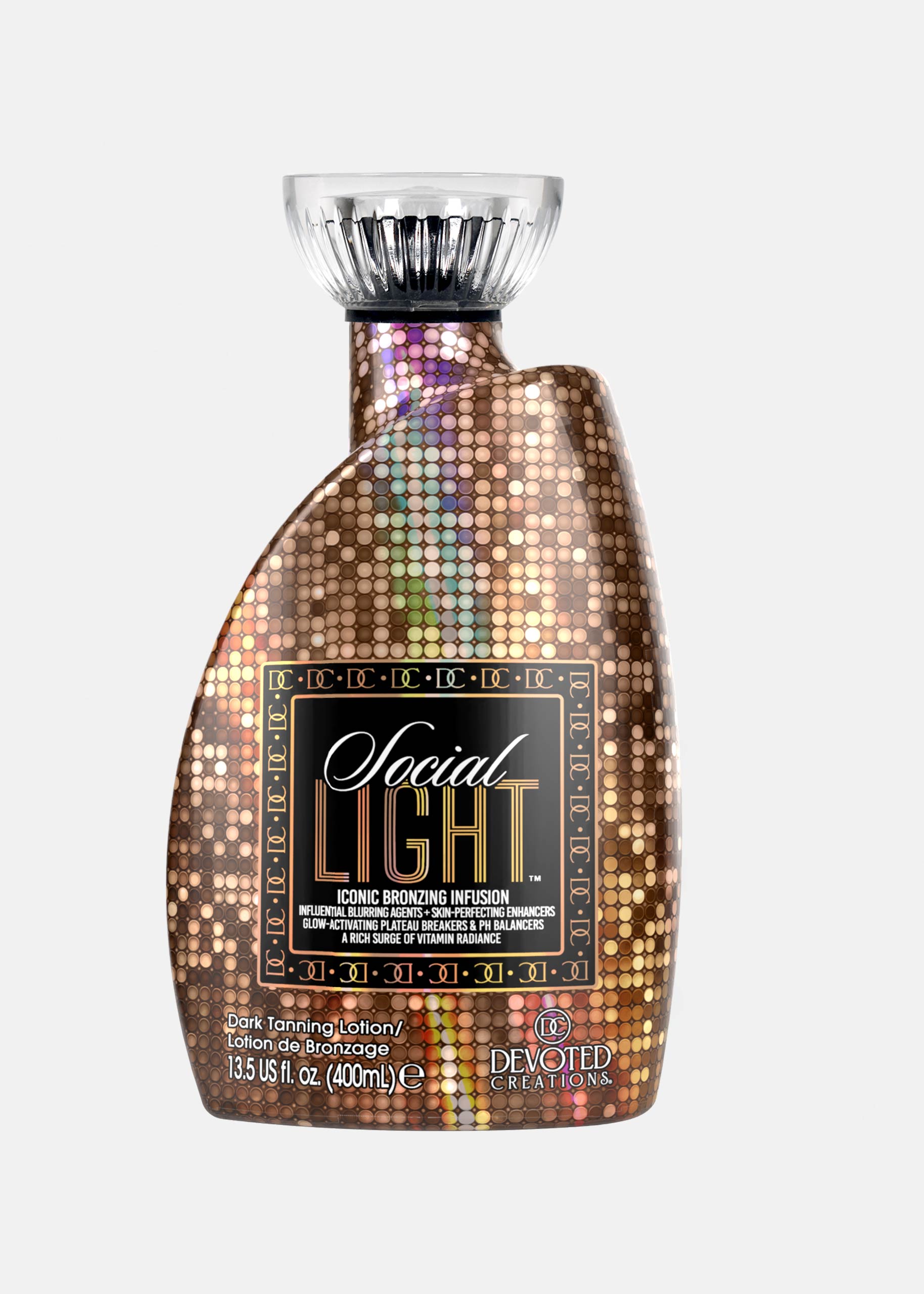 Wenn dein Glow so strahlend ist, übertrifft er den A-List-Status – er ist wirklich einflussreich! Social Light™ ist das hochkarätige Feuchtigkeits-Must-Have, auf das deine Haut gewartet hat! Diese luxuriöse, trendsetzende Fusion aus fortschrittlicher Hautpflege und erstklassigen Bräunungstechnologien wurde entwickelt, um dich in jedem Blitz, Scheinwerferlicht und filterfreien Moment zum Strahlen zu bringen. Die luxuriöse Lotion ist mit unserem exklusiven Collagen Banking Complex angereichert, der hilft, die Haut zu straffen, aufzufüllen und die jugendliche Elastizität zu bewahren, während sie einen strahlenden und raffinierten Glow erhält. Porcelain Flower, das faszinierendste Geheimnis der Schönheit, sorgt dafür, dass die Haut ebenmäßig und glatt wird und einen kristallklaren Teint erhält. Eine opulente Mischung aus Mikro-Goldpartikeln und modischem Vitamin C verleiht einen leuchtenden Schub für diesen tiefen, strahlenden Glanz. Power Peptide, erstklassige Exosome und prominente pH-Balancer arbeiten im Hintergrund, um dich glatt, straff und immer kamerabereit zu halten. Haut, die so weich, so makellos und so strahlend ist, entsteht nicht einfach so – sie wird kuratiert! Für Ergebnisse, die Köpfe drehen, ist es Zeit, ins Rampenlicht zu treten mit Devoted Creations Social Light™.